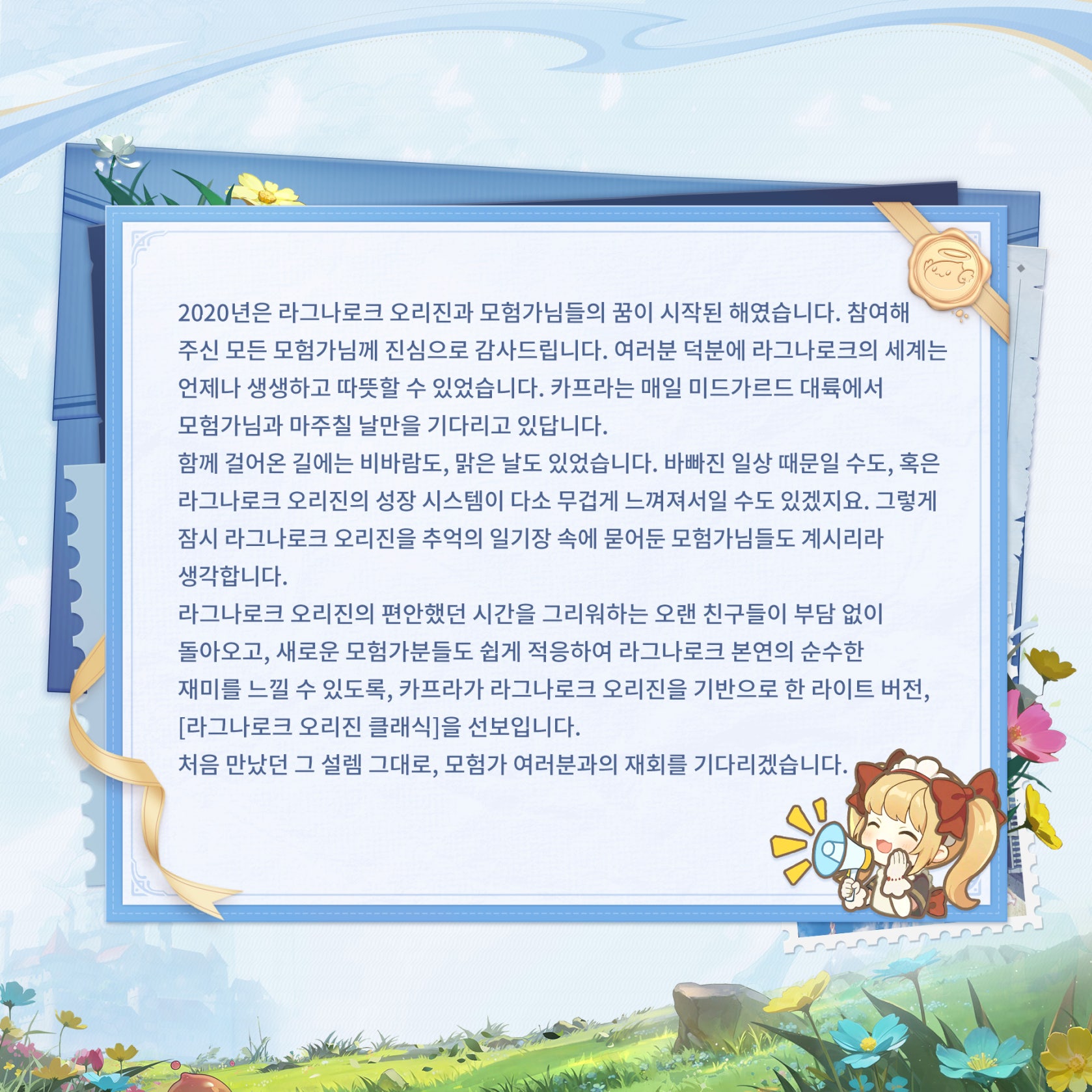 "어떤 모험가님들은 조용히 라그나로크를 일기장 속에 간직해 두셨다는 걸 알고 있어요📖——일상이 너무 바빠서⏳, 혹은 성장 시스템이 너무 복잡해서였을 수도 있죠🧩. 저희도 다 이해합니다~❤️